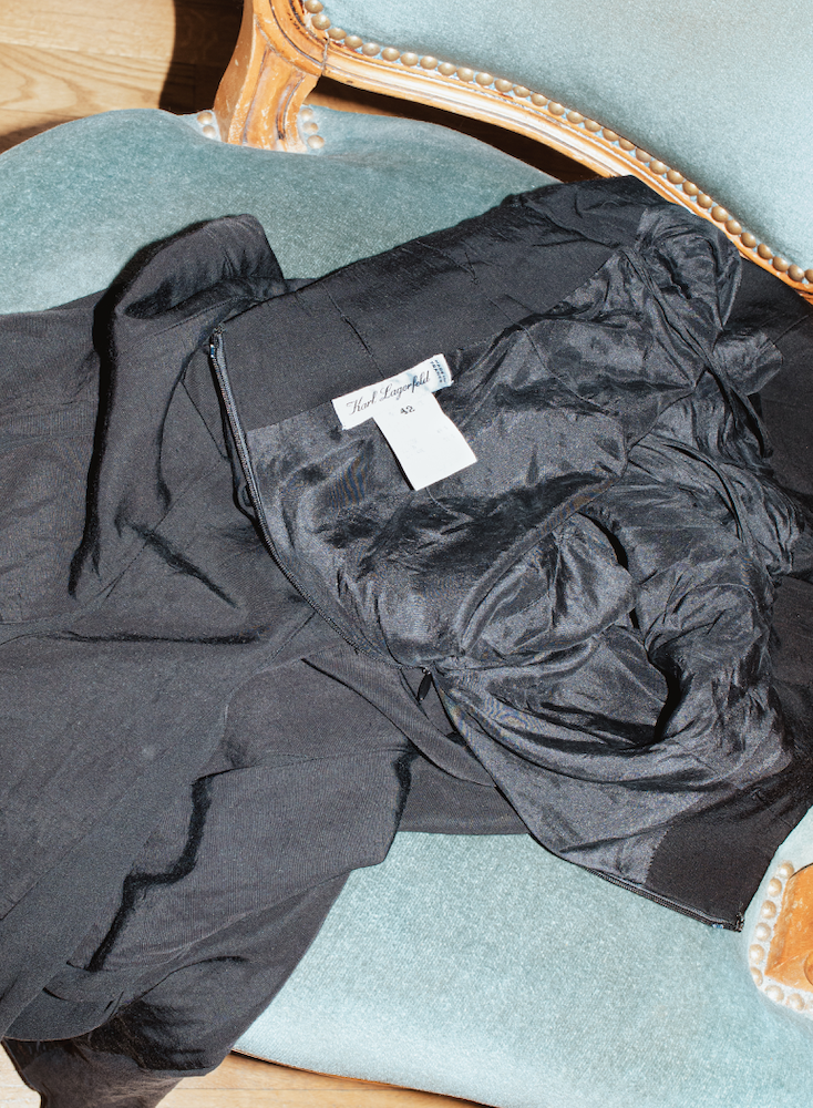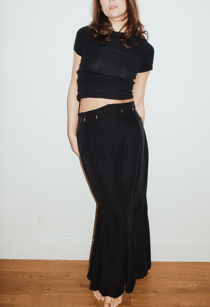 This vintage Karl Lagerfeld long skirt is a perfect choice for all occasions, both formal and casual. For a casual look, pair it with a simple white T-shirt and leather sandals. For a dressier look, pair it with a black blouse and high heels. With its corset-style waist and ruffles, this skirt is a true fashion gem.