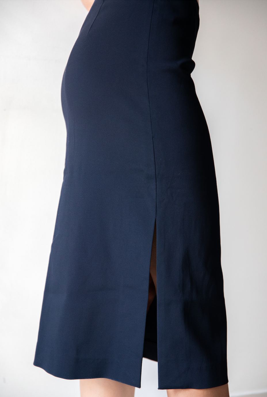 This vintage Prada skirt from the 2000s by Muccia Prada is a timeless and classic fashion piece. Crafted from high-quality dark navy/black fabric, this skirt is both elegant and minimalist. It is short (knee-length) with double side slits, which adds a touch of modernity. The skirt is easy to match and can be worn in many ways to achieve different looks.